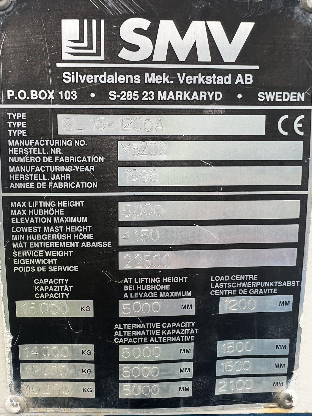 European made SMV forklift 16,000kgs @ 1200mm load centre. Sideshift, fork positioner and 2400mm fork tynes.