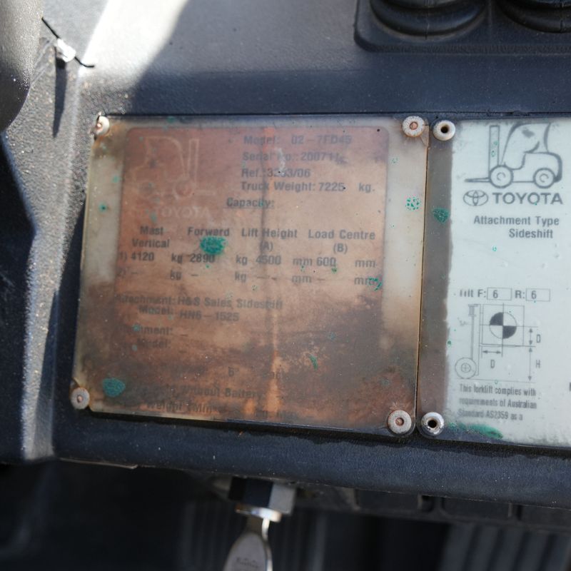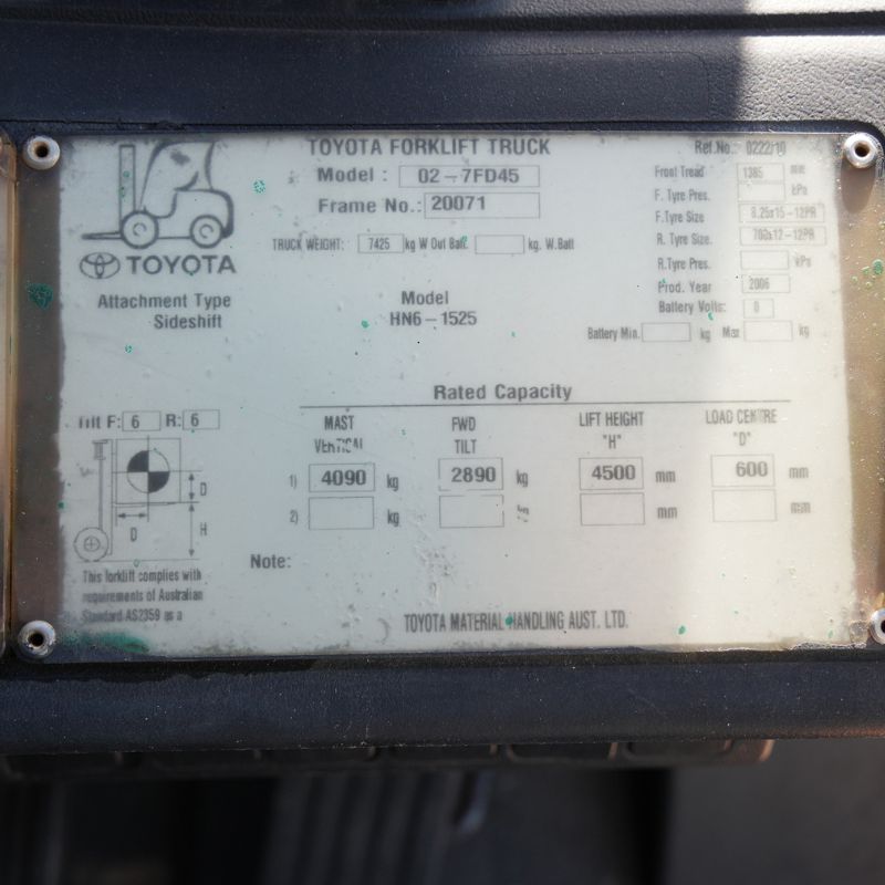 Toyota 4000kg LPG forklift with 4500mm mast, sideshift and fork positioner (Copy)